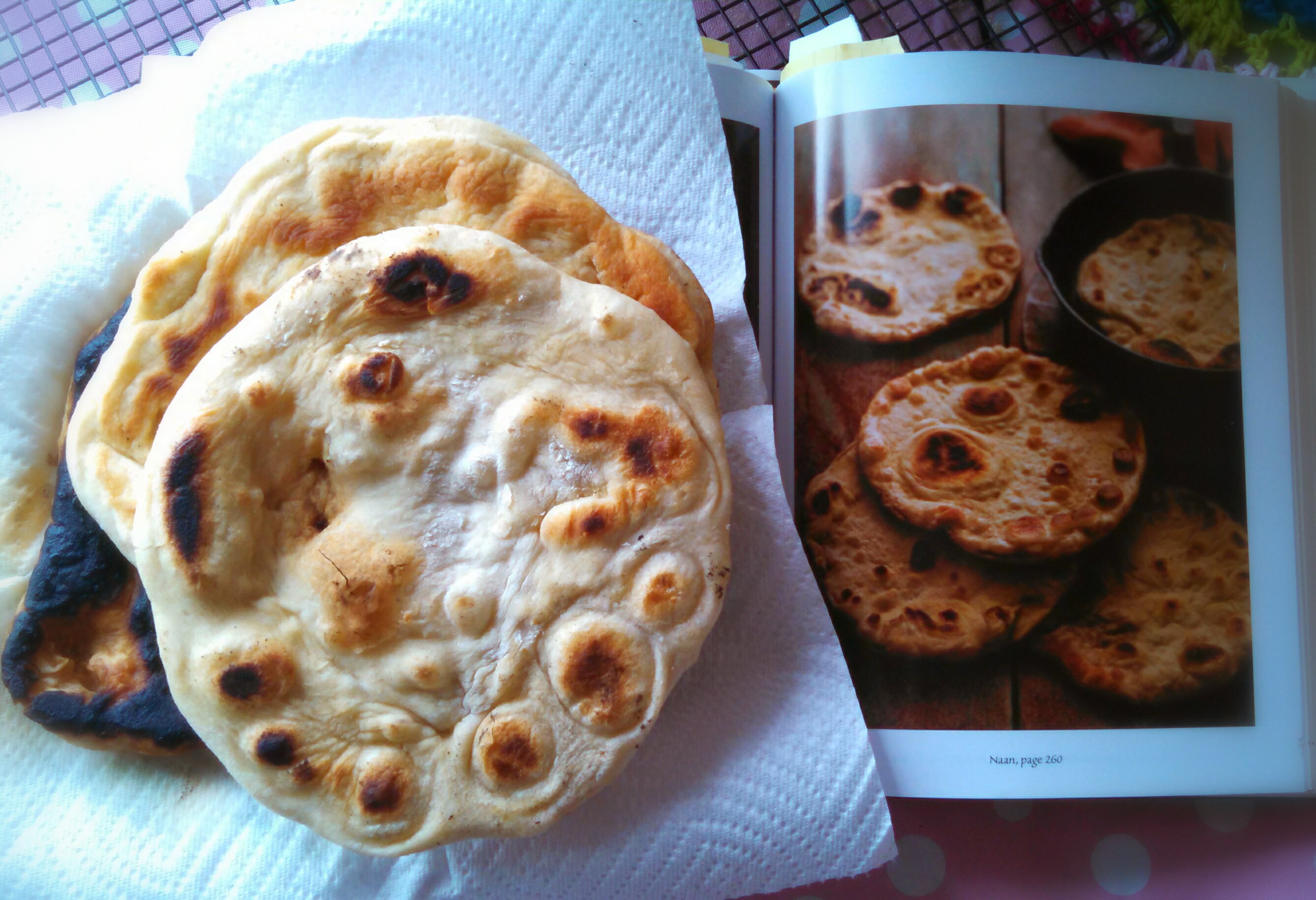 It took three times to get a piece that resembled the pictures in the book. The extremely burned one on the bottom is the one I made when I followed the directions exactly. My apartment still smells like smoke! I know now that “high heat” too high on my stove! It was a good learning experience. I’ll be making naan again, I’m sure.